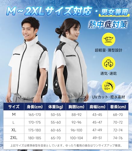 「朝夕の涼しい時間帯は弱で、日中の猛暑は強で使い分けている」との事例もありました。 - デザインがシンプルで男女兼用(Mサイズから2XLまでの展開)、年齢や性別を問わず着用できると好評です。
