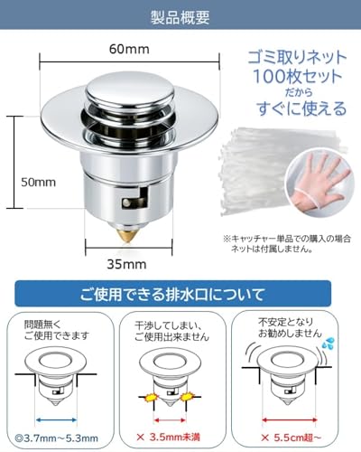 適合する排水口サイズや、取り付け方法についても丁寧に説明されているので、安心して購入できます。
