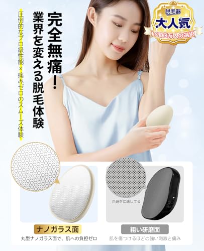 この無痛脱毛器はレーザーや光を使わず、角質除去と物理的な摩擦で産毛やムダ毛をケアする仕様です。
