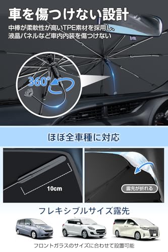 サンシェード 車 フロント 全車種対応 12層ナノ断熱素材【2025改良型 完全フィット・日本特許】360°折れる中棒 車用サンシェード 傘型 折りたたみ式 紫外線99%カット 遮熱 遮光 取り付け簡単 バックミラー対応 曲がるTPU中棒 強化10本骨 車中泊 仮眠 暑さ対策 ワンサイズ(約10cm調整可能) 内装傷防止 収納ポーチ付き 中間 画像