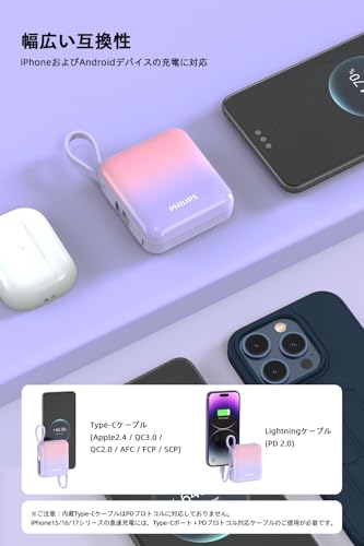 Philips (フィリップス) モバイルバッテリー 10000mAh 大容量 小型 携帯充電器 Lightning type-c ケーブル内蔵 22.5W タイプc ライトニング 4台同時充電 スマホ 持ち運び iPhone 16 / 15 Android iPad 各種機器対応 PSE認証済 (ピンク紫) 中間 画像