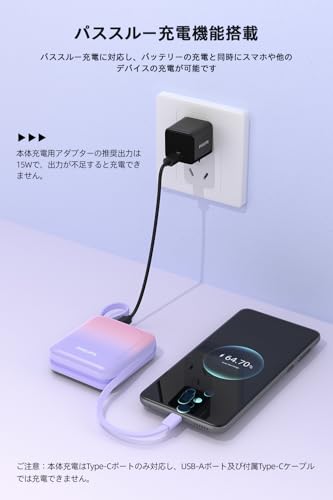 Philips (フィリップス) モバイルバッテリー 10000mAh 大容量 小型 携帯充電器 Lightning type-c ケーブル内蔵 22.5W タイプc ライトニング 4台同時充電 スマホ 持ち運び iPhone 16 / 15 Android iPad 各種機器対応 PSE認証済 (ピンク紫) 中間 画像