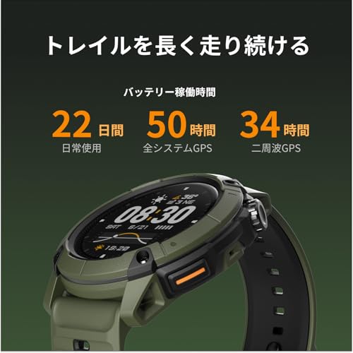 一般的なスマートウォッチのGPSモード連続使用時間が数時間〜十数時間程度であることを踏まえると、22日間の連続稼働はかなりの長寿命バッテリーといえます。