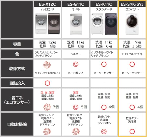 以下は、シャープ ドラム式 洗濯乾燥機 洗濯7kg 乾燥3.5kg 幅59.8cm ヒーターセンサー乾燥 乾燥ダクト自動お掃除 洗濯槽自動お掃除 エコセンサー(4センサー) ES-S7J-WL 左開き クリスタルホワイトと人気ライバル商品の詳細比較表です。