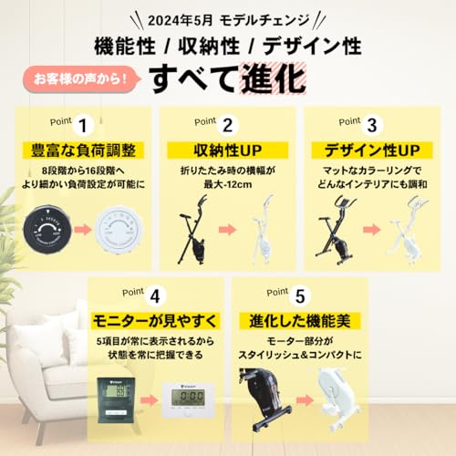 静音設計の非接触式エアホイールはマンションなど集合住宅でも使いやすく、負荷調節は16段階あるため初心者から上級者まで幅広いレベルに対応可能です。