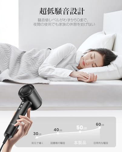 一般的なドライヤーは運転音の大きさがストレスになることがありますが、本製品は静音設計が施されているため、使用時の騒音レベルが大幅に軽減されています。