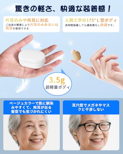 自動降噪機能により騒がしい環境でも音が明瞭に聞こえやすく、耳穴型の目立たないデザインは外出時の使用にも向いています。