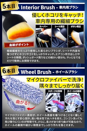 - 多機能性 :ボディ用、ホイール用、タイヤ用、隙間用など用途に応じて6種のブラシを使い分け可能です。