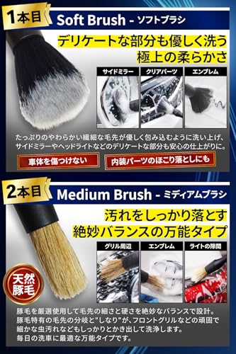 この6本セットには、ボディ用の柔らかな筆ブラシ、頑固な汚れをこすり落とすホイールブラシ、細かく入り組んだ部分用の隙間ブラシ、さらにはタイヤやディテール向けの専用ブラシが含まれており、さまざまな用途に対応可能です。