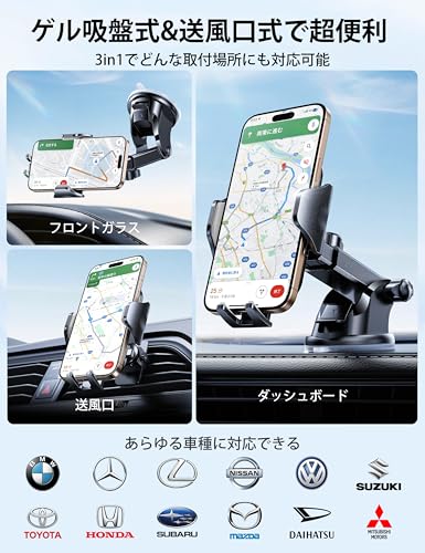 このスマホホルダーは全車種対応を掲げており、粘着ゲル吸盤・送風口兼用設計により様々な車内環境にフィットします。