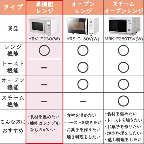 特に、山善の23L大容量電子レンジ〈YRV-F230(W)〉はシンプルな単機能ながらも、ヘルツフリー対応で国内外の周波数に対応し、フラットテーブル設計により庫内のスペースを最大限に活用できる点が魅力です。