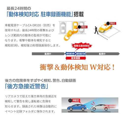 • 前後カメラの同時録画で不意のトラブルも逃さない