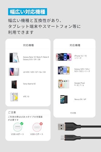 AnkerのUSB-C & USB-Aケーブル(Flow)は、15W給電対応により急速充電が可能で、多くのUSB-C機器に対応しています。
