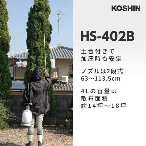工進(KOSHIN)の蓄圧式噴霧器 HS-402Bは、4リットルのタンク容量と伸縮2段ノズルを備えており、さまざまな作業環境や散布量に柔軟に対応できる点が評価されています。
