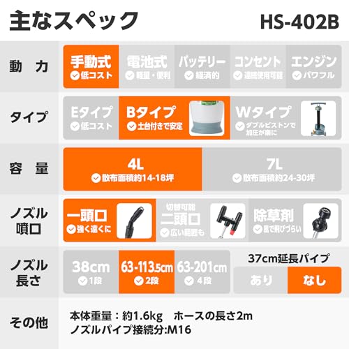 4LタンクのミスターオートHS-402Bは、使いやすさと適度な容量で家庭や園芸ユーザーのニーズに応える商品です。