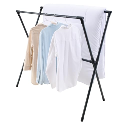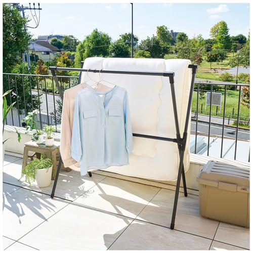 伸縮式X型の設計により、干したい洗濯物や布団のサイズに応じて幅を調節可能で、使わない時はコンパクトに折りたためるのが特徴です。