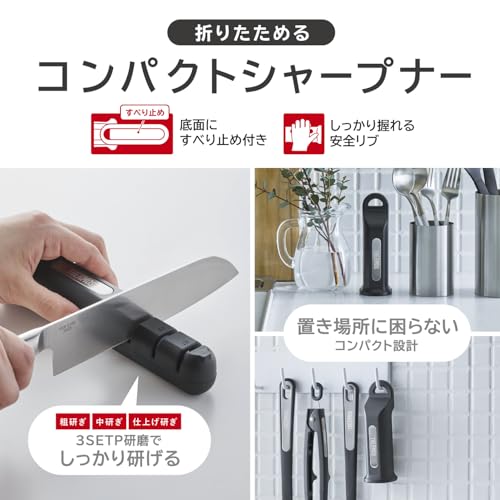この包丁研ぎは3STEPで包丁の切れ味を復活させ、コンパクトな設計で収納性も高い点が特長です。