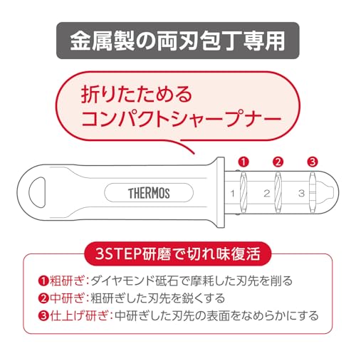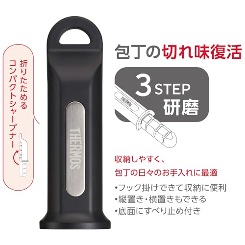 サーモス コンパクトシャープナーは、家庭用の一般的な洋包丁や和包丁に適し、3STEP研磨で切れ味を効率的に改善できます。
