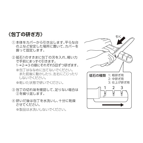 A: ステンレス製や一般的な家庭用包丁に適していますが、セラミック包丁や特殊刃には対応していません。 - Q: 安全な使い方はありますか?