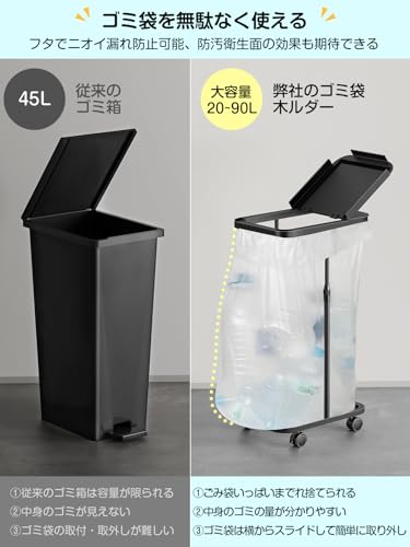 このホルダーは20Lから90Lまでの幅広いゴミ袋サイズに対応できるため、多様なゴミの分別に役立ちます。