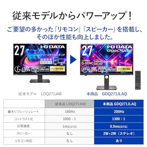 IODATA GigaCrysta MiniLED ゲーミングモニター 27インチ 200Hz 0.9ms WQHD AHVAパネル 非光沢 広色域 ブラック 無輝点保証対応 (量子ドット/HDR1000/HDMI×2/DisplayPort/VESA対応/スピーカー/リモコン/高さ調整/縦横回転/土日サポート/日本メーカー) EX-GDQ271JLAQ 中間 画像