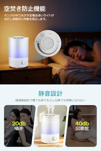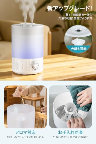 この加湿器は、卓上や寝室、オフィスでも使いやすいデザインを採用し、日常の乾燥対策に役立つ優れた機能を備えています。