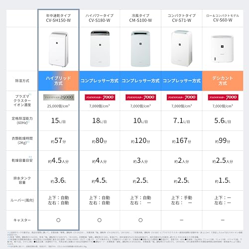 シャープの衣類乾燥除湿機CV-SH150Wは、年中速乾が可能なハイブリッド方式を採用し、最大除湿量15L/日とパワフルな性能が特徴です。
