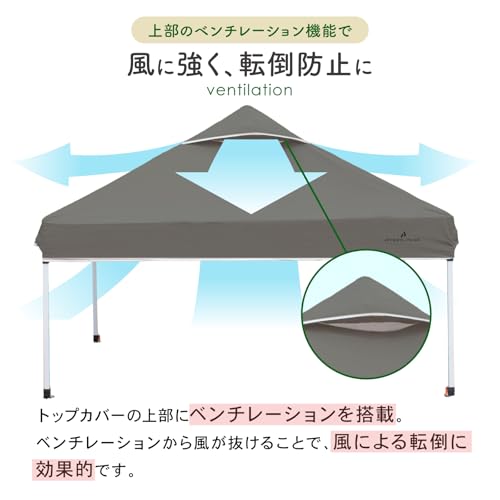さらに、風抜けベンチレーションが天幕上部に設けられているため、風通しがよく、強風時にもタープが煽られにくい構造となっています。