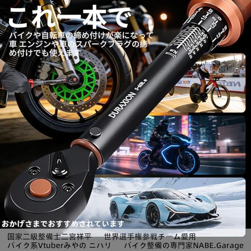DURAXIONの製品は、5-60N.mの幅広いトルク設定が可能で、バイクの各部品や車のエンジン整備にも対応できます。