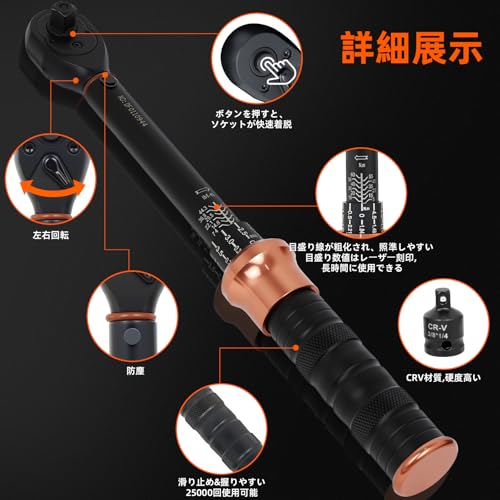 差込角9.5mm(3/8インチ)で、5-60N.mの幅広いトルクレンジ範囲をカバーし、自転車からバイク、車のエンジン整備まで幅広く活用できます。