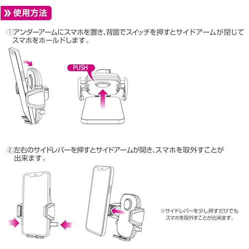 PPH2111では、ボタンを押すだけでホルダーが自動的に開閉し、スマホをすぐに装着・取り外しできます。