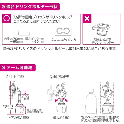 - 【デメリット】車種によってはドリンクホルダーの形状が合わず装着できない場合があること、ドリンクホルダーとしての利用が難しくなることがある