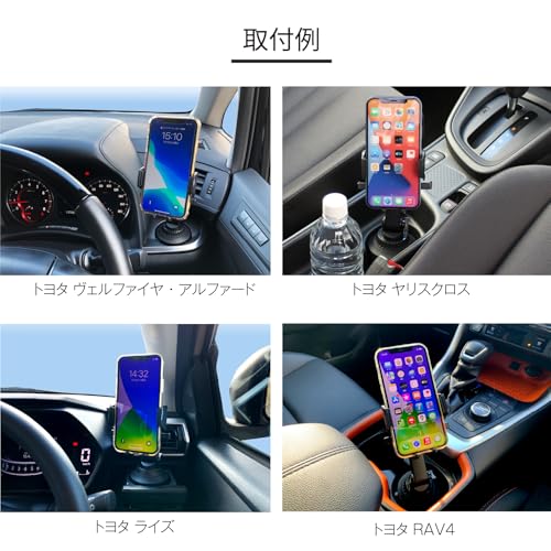 ドリンクホルダーに取り付けるタイプで、手帳型ケースにも対応し、スマホを縦横どちらの向きにも設置可能な設計です。