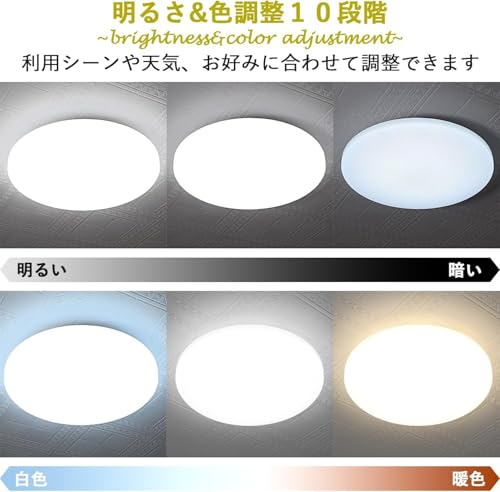 - 明るさの調整が簡単: 10段階調光・調色機能により、昼間は明るく、夜は柔らかな光に切り替えることができ目の疲れを軽減できます。
