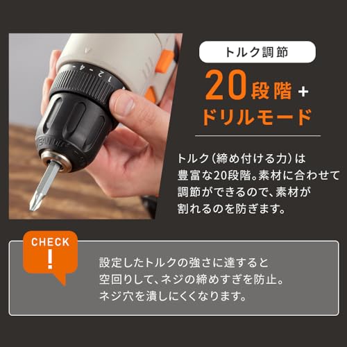 高トルクモードでは硬い素材の穴あけやネジ締めが可能で、低速モードは精密な作業やネジの微調整に適しています。