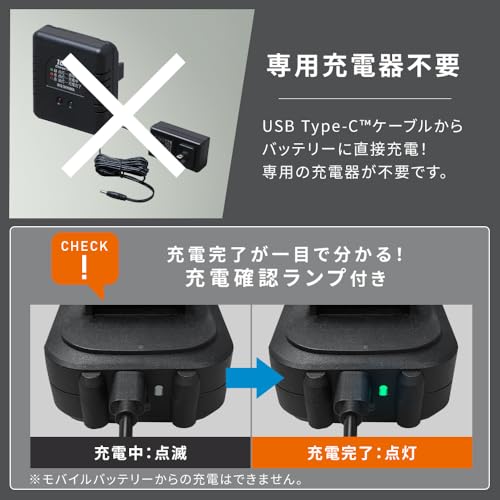 このバッテリーは充電器不要で、USB Type-C充電に対応している点も特徴です。