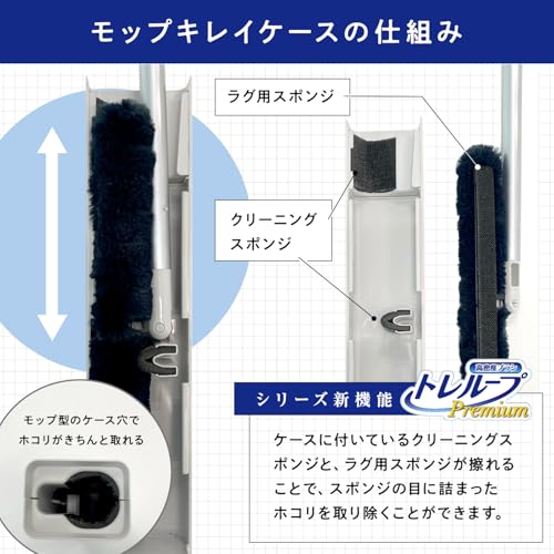 激落ちくんのトレループ Premiumは、ケースにモップを通すだけで自動的にホコリを取り除く機能を備えており、繰り返し使用できる高密度ブラシを搭載しています。