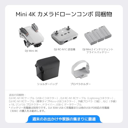 本製品はドローン本体に加え、2つのバッテリー、DJI RC-N1C送信機、ショルダーバッグ、そしてプロペラホルダーが同梱されています。
