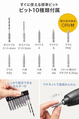 付属ビット10種類とホルダーの活用で、日々のDIYや家具組立てを効率よく進めたい方には非常に役立つ商品です。