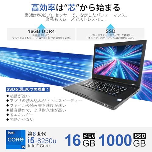 例えば、NECのVersaPro VKT16Xは第8世代Core i5プロセッサ、16GBメモリ、そして高速なSSD 1000GBが搭載されており、最新のWindows 11 ProとOffice 2019をプリインストール済みです。