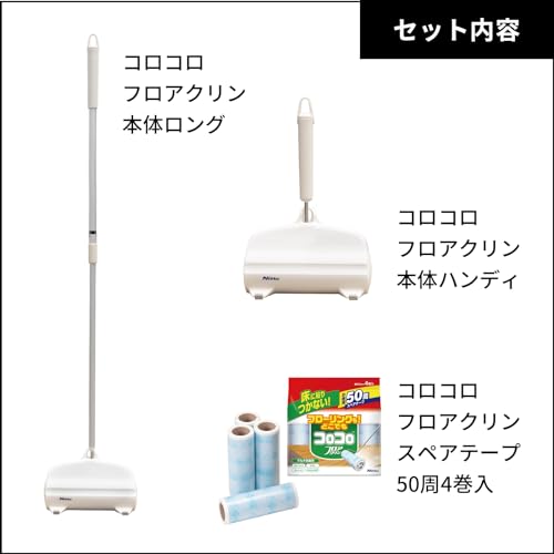 ニトムズの「コロコロ フロアクリン」は、伸縮ロングタイプとハンディタイプの本体に加え、スペアテープ50周付きで販売されています。
