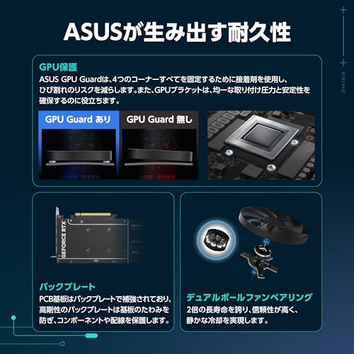 ASUS独自のGPU Guardと304ステンレススチール製I/Oブラケットによる堅牢な取り付けも、安心して使用できる要素の一つです。