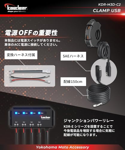 KaedearのクランプUSBは、一体構造で配線を短くし、SAEコネクター採用で着脱も簡単に。