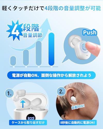 しゅうおんき集音器は軽度から中度の聴力低下に対応し、4段階の音量調整が指先の軽いタッチだけで可能です。