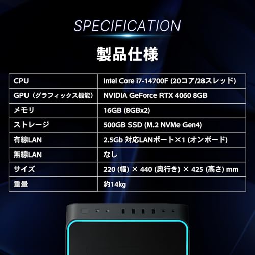 この点で、GALLERIA RM7C-R46はインテル® Core i7-14700F とNVIDIA GeForce RTX 4060を搭載し、メモリ16GB(DDR5-4800)と500GBの高速NVMe SSDを備えた構成で、多様な用途に対応可能なゲーミングPCとして注目されています。