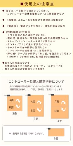 暖房面積を片面・全面で切り替える機能や温度調節のコントローラーが付いているため、こたつの下に敷いても快適に使えます。