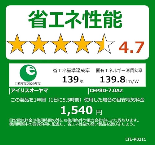 以下は、【節電モデル】アイリスオーヤマ LEDシーリングライト~8畳 10段階調光タイプ 最大39%電気代削減 節電モード搭載 自然に見える光 CEP8D-7.0AZ【Amazon.co.jp限定】と人気ライバル商品の詳細比較表です。