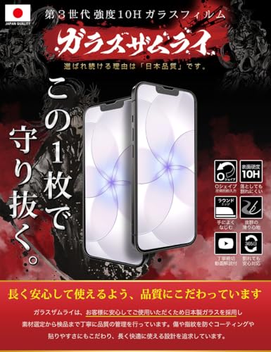 ガラスザムライ iPhone 15 Pro用保護フィルムは、硬度10Hの日本製ガラスを使用し高い耐久性を誇ります。