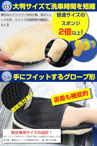 必要に応じて分割購入を検討ください。 - ムートン素材はホコリや砂などの異物を絡めやすい性質があるため、洗車前にグローブを軽く水洗いし異物を除去してから使用し、塗装面へのキズ防止を徹底することが重要です。