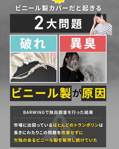 BARWINGトランポリン新モデルは耐荷重150kgで子供から大人まで使え、安全面は8本脚構造とクッションカバーで衝撃を和らげます。
